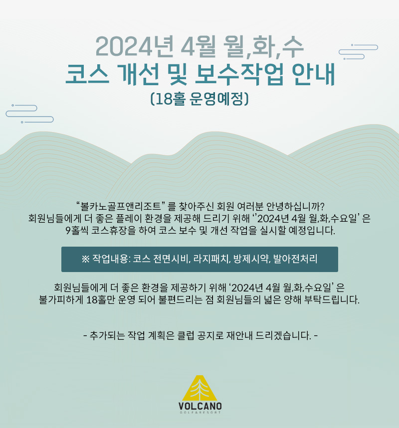 [공지] 2024년 4월 월,화,수 코스 개선 및 보수작업으로 인한 18홀 운영 안내